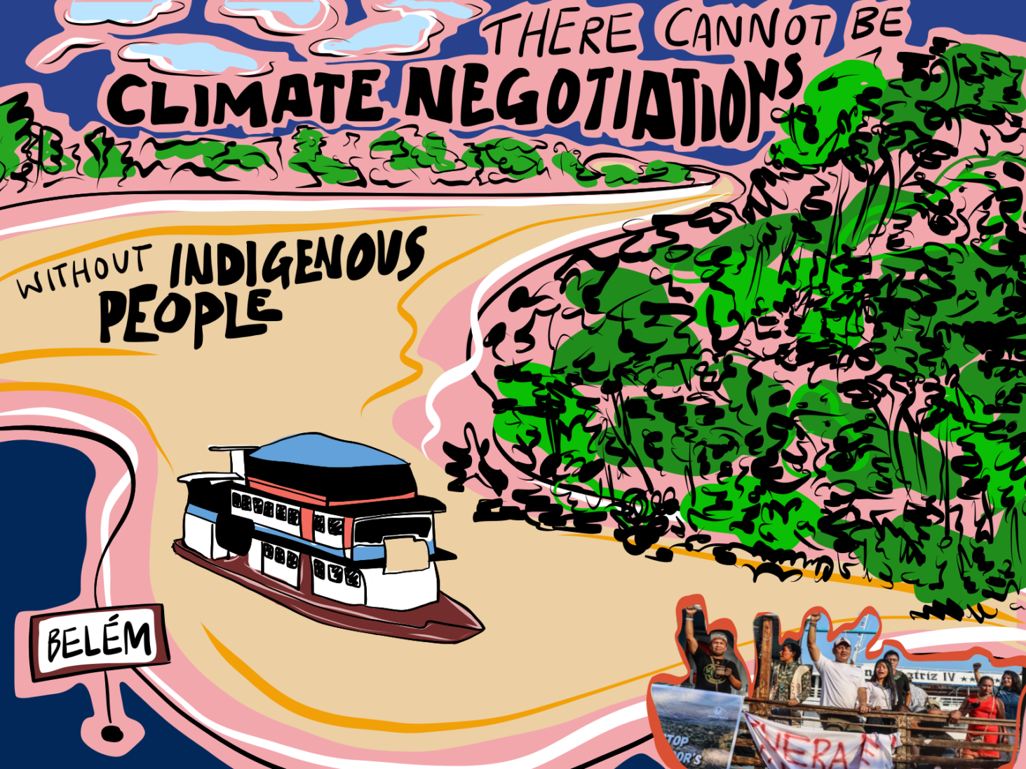 Illustration by Natasha Phang-Lee @npl_illustration who says, “the illustration shows the Yaku Mama Flotilla journeying along the Amazon river towards Belem. To the right is dense green forest and in the foreground is a group of the Indigenous people on board the flotilla. The illustration includes the phrase: there cannot be climate negotiations without Indigenous people.”