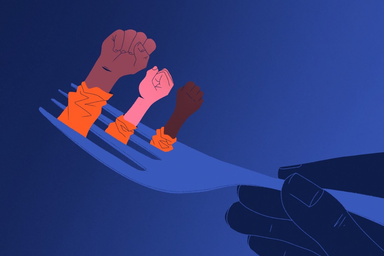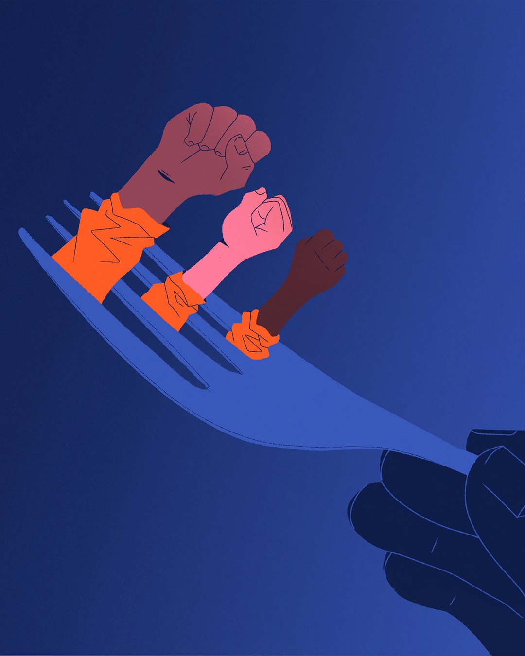 Illustration by @kalakal_klk who says, “Fists of prison inmates are coming out of the dents of a fork, both symbols of hunger and incarceration. Their warm orange tones contrast with the blue background, a reminiscence of a cold carceral system working actively against collective action.”
