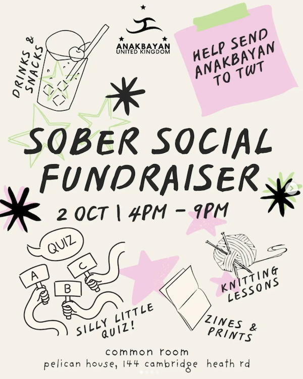 Anakbayan, a national democratic Filipino youth in the UK, is planning on sending a delegation to The World Transformed in October. To help raise funds The Pelican House is hosting a range of events from quizzes to knitting circles on October 2nd.