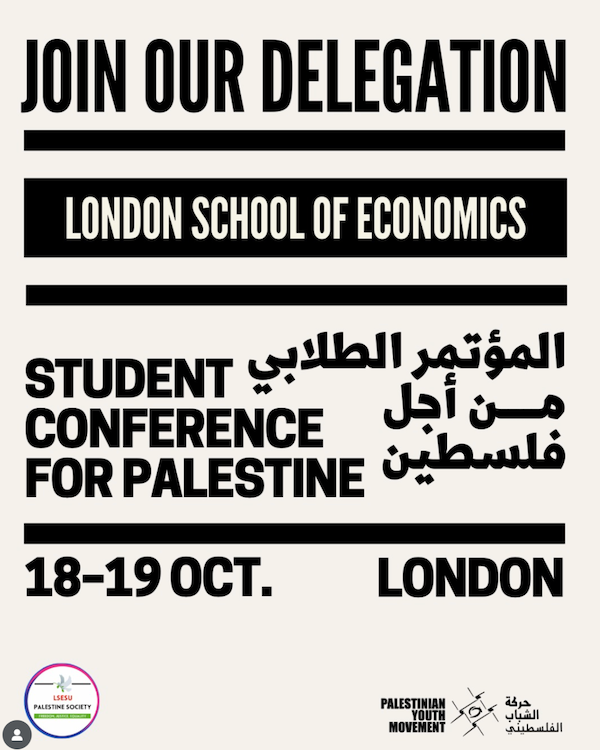The LSE Students for Justice in Palestine are bringing a delegation from LSE to the National Student Conference for Palestine! If you are interested in organising for Palestine and want to learn more about the student movement, join their delegation on 18-19th of October!