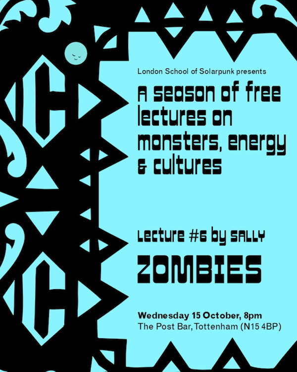 The 6th edition of the school’s Monster Lecture Series, Sally from The London School of Solarpunk, will be asking: Zombies: What does envisioning an apocalypse expose about our care systems? From 8pm on October 15th, at Post Bar in Tottenham.