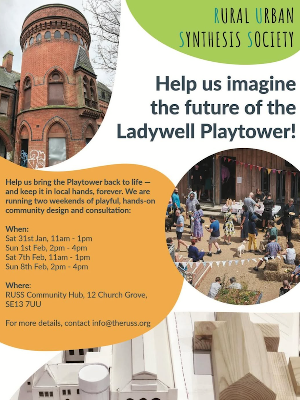 Two weekends (31st January & 7th February 11am-1pm and 1st & 8th February 2-4pm) of community sessions are inviting input to help bring the Ladywell Playtower back into local hands as a creative mixed-use space and affordable housing.
