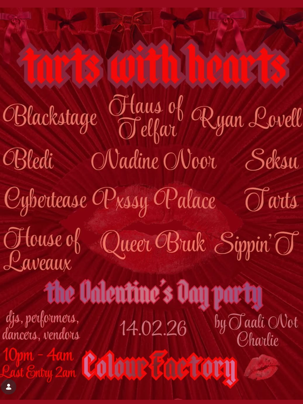 Tarts With Hearts is a high-octane night of DJs, collectives, ballroom battles, pole, performances, vendors, and more, celebrating love in all its forms with an all QTIBPOC all-star lineup and the launch of Taali Not Charlie’s new club night.