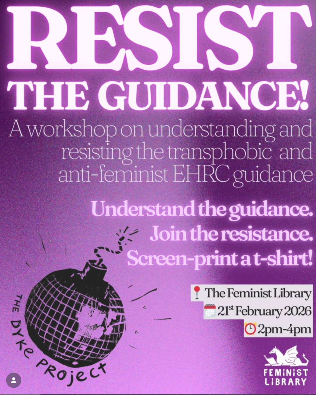 The Dyke Project is hosting a free workshop on 21st February at the Feminist Library exploring and resisting the Equality and Human Rights Commission’s proposed guidance on single-sex spaces, with discussion, resources and food.