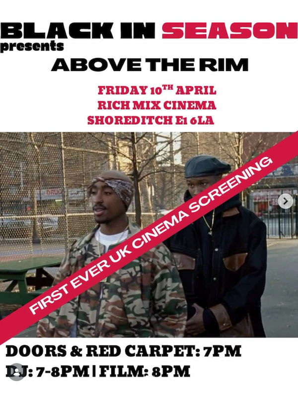 Black In Season Film Club presents the first UK screening of Above the Rim, bringing a 90s classic to the big screen with live music, DJ sets, red carpet vibes. A fully immersive celebration of film and culture on April 10th at Rich Mix.