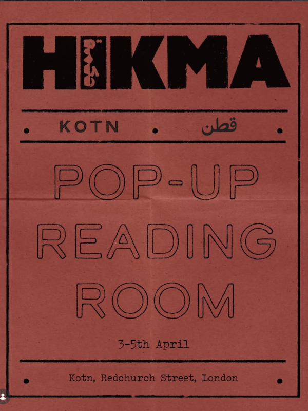 HIKMA x KOTN is a London pop-up reading room happening this weekend, inviting visitors to explore books on Iraqi art, heritage, and ancient civilisations, with free posters available throughout.